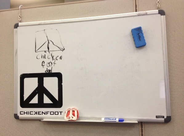 Them: “Chickenfoot? What’s that?” Me: check this out http://www.chickenfoot.us (a few seconds pass by…) Them: “No shit!” Me: “I know!”I would then proceed to tell my friend/coworker/random stranger everything I knew about the band, whether they wanted to hear it or not: when the album was coming out, how they got together, if they were going to tour, if I thought it would be good, etc. I did this so often that my friend Brian created a Chickenfoot whiteboard sticker for me (my kids got in on the act too, hence the “Chickenfoot Dad” scrawl and red clay logo).